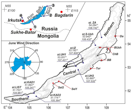 Lake Baikal is the largest and the most ancient lake in the world. Its size of 632 km in length and 1.642 km in depth assumes a long hydrological history and residence time. The watershed of the lake is approximately 557.000 km2 and covers Northern Mongolia and East Siberia. Tributaries of Lake Baikal flow over landscapes of steppe, boreal taiga, permafrost, and mountains. The main tributaries of the lake are the Selenga (~25.57 to 29.43 km3 yr−1, ~50% of the total annual inflow), Upper Angara (~8.37 to 8.56 km3 yr−1, ~12% of the total annual inflow), and Barguzin (~3.71 to 3.9 km3 yr−1, ~6% of the total annual inflow) rivers [1]. Table 1 shows monthly hydrological parameters of Lake Baikal when the maximum inflow and evaporation occur in June and December, respectively. Outflow through the Angara River is stable (~5 km3 month−1) during the year. Although Lake Baikal is located in the Baikal Rift Zone, the groundwater input is <4.5% of the total water input [2].