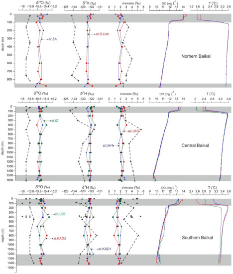 At the stations (UH1, UH2, and IZ) of the central basin of Lake Baikal, there are also three zones with different temperatures, oxygen concentration, δ18O, and δ2H. The temperature profiles of the stations were uniform and smooth. The temperature in the upper zone (0 to 150 m) ranged from 2 to 3.6 °C, whereas, in the 0–80 m layer, it ranged from 2 to 2.4 °C. This 0–80 m layer was colder than the upper layer in the southern basin. The temperature gradually decreased from 3.6 to 3.2 °C in the middle zone (150 to 1500 m). Temperature changes were insignificant (around 0.05 °C) in the bottom zone (1500–1620 m). The DO varied from 13.58 to 9 mg L−1 in the upper and middle zones, while oxygen concentration increased to 9.9 mg L−1 in the bottom zone. In general, the station IZ was enriched in the oxygen of ca. 0.5 mg L−1 compared to stations UH1 and UH2 in the upper zone.