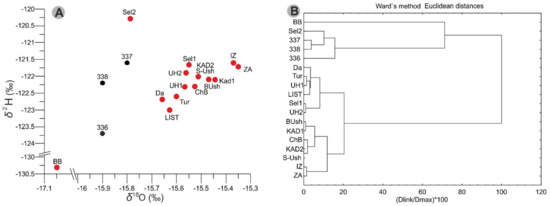 Panel (A)—isotopic composition of the surface water in Lake Baikal at June 2021 (red circles) and June 1991–1992 (black circles, No. 336, 337 and 338) from [2]. Panel (B)—the result of cluster analysis notes that there is no difference between the southern, central, and northern Baikal (see Figure 1) in the isotopic composition of the surface water.