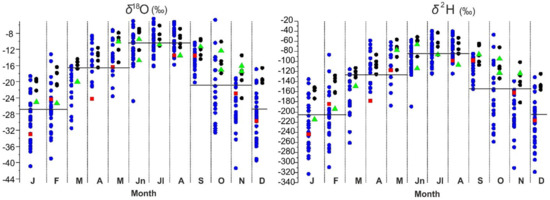 Monthly isotopic characteristics of regional precipitation. Blue circles—Irkutsk at 2012–2017, black circles—Bagdarin at 1996–2000, red circles—Sukhe-Bator 2002–2003, green triangles—Irkutsk at 1971, 1990. Horizontal black lines—seasonal means isotopic values.