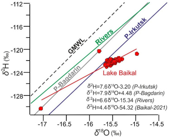 The seasonal means of regional precipitation for δ18O and δ2H, respectively, amount to −27‰ and −209.2‰ in winter, −16.3‰ and −126.2‰ in spring, −10.3‰ and −82.0‰ in summer, and −20.2‰ and −151.6‰ in autumn (Figure 4). Figure 5 shows that regional precipitations are close to Global Meteoric Water Line (GMWL), although they are isotopically lighter. Rivers inflow also shows offset from GMWL. The annual rivers inflow is −15.5‰ for δ18O and −117.4‰ for δ2H [2]. The isotopic composition of Lake Baikal is close to the precipitation of Irkutsk, whereas the δ18O and δ2H compositions of some surface samples were close to ones for Bagdarin and Irkutsk (Figure 5). In general, the isotopic composition of Lake Baikal is “lighter” compared to regional precipitation and rivers inflow. On the other hand, vapor from Lake Baikal should deplete the isotopic composition of precipitation in Irkutsk, and this influence of the lake increases in autumn when evaporation is the maximum. This feature of Irkutsk most likely explains the isotopic difference with Bagdarin.