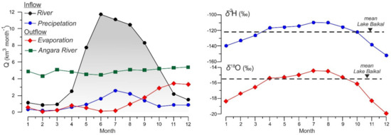 (Left) pane—seasonal variation in the hydrological balance of Lake Baikal. (Right) pane—weight average season isotopic characteristic (red and blue curves) of inflow into Lake Baikal, and the mean values of δ18O and δ2H (black dashed lines) for the lake.