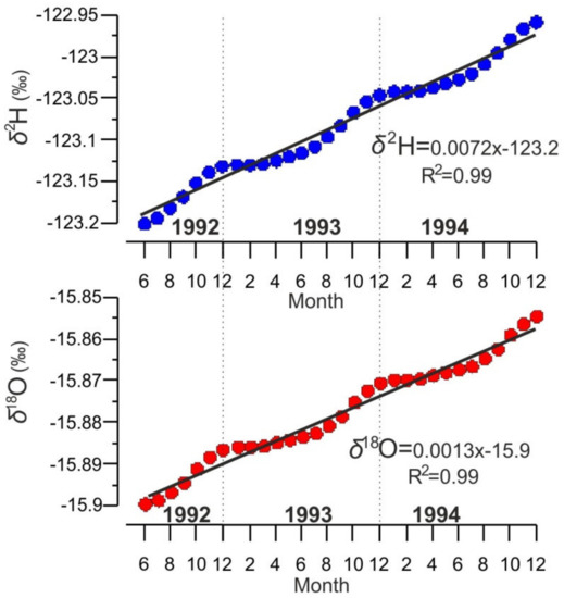 The example of changes in δ18O and δ2H in a month scale, when June 1992 was the beginning for calculation Equations (1) and (2).