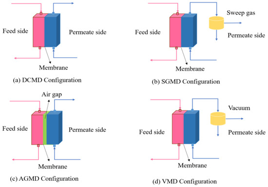 MD is a thermally driven process in which only vapor molecules are transported through a porous hydrophobic membrane. The liquid to be treated is in direct contact with the hydrophobic side of the membrane, which prevents the liquid from passing through the membrane pores and forms a liquid/vapor interface at the inlet of the membrane pores due to its hydrophobicity [15]. According to the different permeation sides, it can be divided into the following four types [15,16,17,18,19,20,21]: