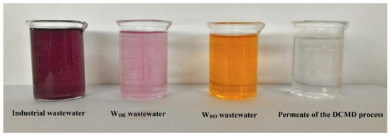 A visual view of the textile wastewater (industrial wastewater, wastewater by dispersing red dye (WDR) and the wastewater by reactive orange dye (WRO)) and the permeate after DCMD treatment [70].