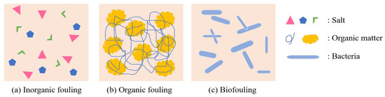 Schematic diagram of three membrane fouling types: (a) Inorganic fouling, (b) Organic fouling, and (c) Biofouling.