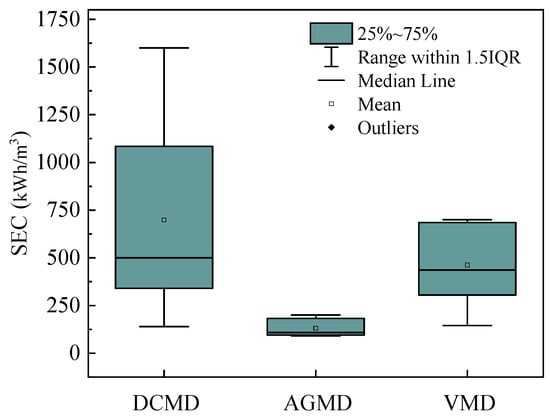 - Khayet, M. Solar desalination by membrane distillation: Dispersion in energy consumption analysis and water production costs (a review). Desalination 2013, 308, 89–101. [Google Scholar] [CrossRef]