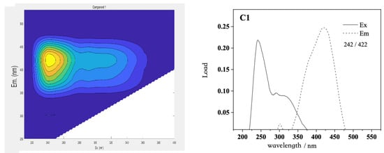 The excitation wavelength of component C1 was at 242 nm, and the maximum emission wavelength was near 422 nm, which reflected the land-based high-molecular-weight humic acid, which was mainly from the degradation of higher plants or soil leaching. Component C2 had two obvious excitation wavelengths at 220 and 272 nm, and the maximum emission wavelength was 422 nm, which reflected the fluorescence peak of low-molecular-weight fulvic acid, which mainly came from the fluorescence peak formed by biodegradable organic compounds. Component C3 had two obvious excitation wavelengths at 232 and 286 nm, and the maximum emission wavelength was 338 nm. It had binding peaks similar to those of protein and fulvic acid, which have a red shift compared with the conventional tryptophan-like peak. Component C4 had an obvious excitation wavelength at 270 nm and the maximum emission wavelength was 478 nm, reflecting the fluorescence peak formed by the polymer humic acid.