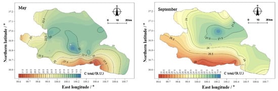 There were obvious differences in the spatial distribution of the permanganate concentration index in Qinghai Lake (Figure 10). In May, the range of the permanganate concentration index was 1.80–4.50 mg/L, with an average of 2.21 mg/L. In September, the range of the permanganate concentration index was 1.90–14.50 mg/L, with an average of 2.83 mg/L, and in October, the range of the permanganate concentration index was 1.80–4.50 mg/L, with an average of 2.29 mg/L. In May and September, the permanganate index in the east was higher than in the west. In October, the permanganate index of the water body showed three high areas, namely, the center of the lake, the east and the west, and the shore area close to the center of the lake. From the perspective of the spatial distribution characteristics, except for the center of the lake in October, areas with high values appeared close to the shore. Therefore, external inputs may be the reason for the higher concentrations of permanganate in the water body of Qinghai Lake than in other areas.