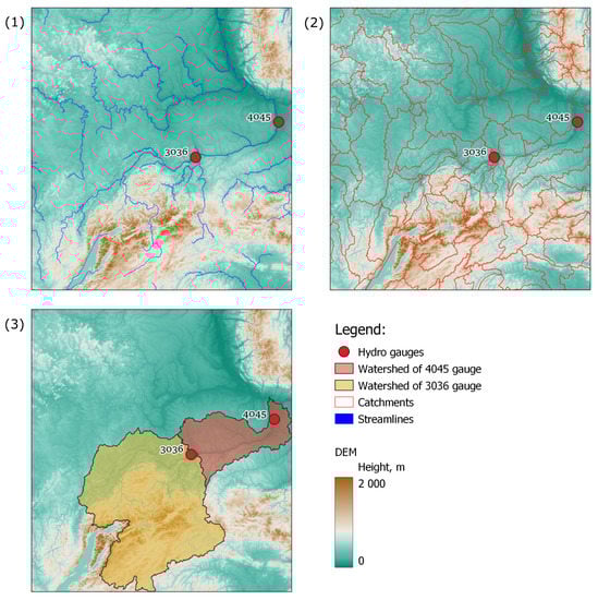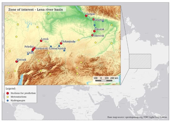 The input data for modeling and validation are provided by The Russian Federal Service for Hydrometeorology and Environmental Monitoring and Federal Agency of Water Resources [,]. For both physical modeling and the machine learning approach, data from hydro gauges and weather stations were used. Locations of stations and zone of interest are shown in Figure 1.