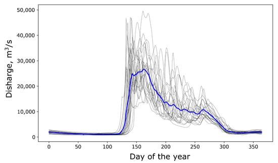 Flow graph for “Tabaga” hydro gauge on the Lena River. The blue line shows the average values for the period from 1985 to 2011. The black lines show the values of river flow for specific times each year.