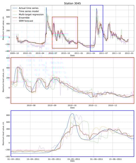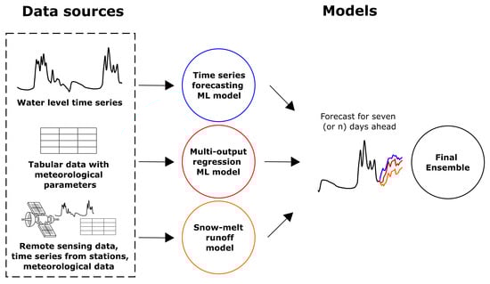 As an example, the multi-output regression model predicts water levels based on mostly meteorological data. The time series forecasting model predicts only on the basis of previous level values using autoregressive dependencies. Then, if incorrect values of meteorological parameters are obtained and the multi-output regression model is producing incorrect forecasts, the time series forecasting model still can preserve the stability of the ensemble. The use of the physical model makes it possible to interpret the forecast.
