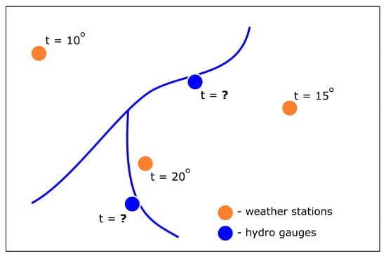 As was mentioned before, the primary data set contains observation from two sources: weather stations and hydro gauges, which are located at some distance from each other. The problem can be illustrated by Figure 4. Thereby, some parameters require interpolation to neighboring points for forming the complete dataset for each gauging station.