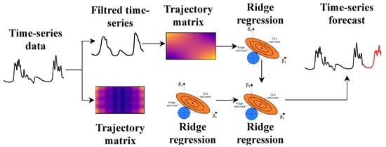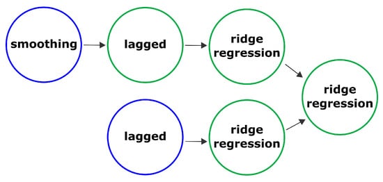 The pipeline “lagged-ridge regression” transforms the maximum daily water level one-dimensional time-series into a trajectory matrix using a one-parameter shift procedure. This makes it possible to use lagged vectors as features for a machine learning model without involving exogenous data. Furthermore, ridge regression is applied to the obtained trajectory matrix, since it is more likely that some columns of the matrix are correlated with each other. It can lead to unstable estimates of regression coefficients. Adding a filtering operation allows “smoothing out” the original time series, reducing the variance and increasing the conditionality of the trajectory matrix at the stage of lagged transformation. Visualization of the composite pipeline and operations in the nodes of this model is shown in the Figure 7.