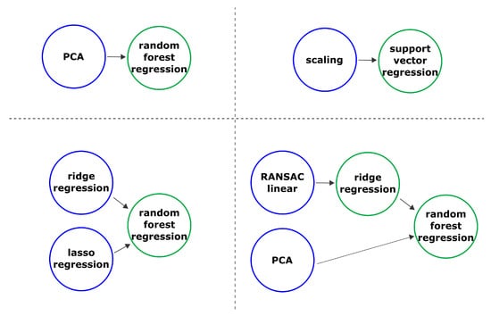 The pipeline presented in Figure 3 allows using as much data as possible. The primary reason to use an ensemble in a composite pipeline is a reduction of forecast error compared to stand-alone models []. Also, it allows specialization of individual blocks of the composite ensemble to solve the utilitarian task.