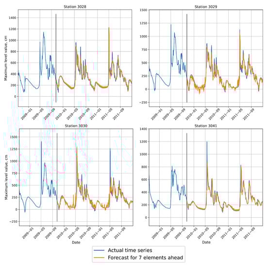 To reduce the damage caused by natural disasters, forecasting systems are used. They are based on models that predict water levels and flow rates. Classical methods used in hydrology are based on determining the dependence between meteorological data, basin and substrate characteristics, and modeled target values []. There are widely used approaches to modeling nature processes, which were implemented in the form of hydrological models. Such models mainly rely on the deterministic approach, but some models operate with elements of stochastic nature []. It allows us to reproduce a wide class of processes with suitable hydrological models. The advantage of such models is that they are can be well interpreted by experts []. Most models are not implemented for a specific region but represent the bonds between the components of almost any river system.
