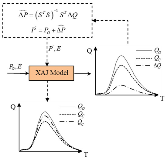 The main idea behind the DSRC method is that it firstly retrieves the rainfall errors from the outlet flow errors, then updates the rainfall series and finally reruns the model with the updated rainfall series. In this method, given a hydrological model that generates outlet flow Q as a function of rainfall P, the variation process of the outlet flow change by the unit perturbation in rainfall is called the system response curve. Based on this, multi-time system response curves form the system response matrix , and this matrix sets up the relation between rainfall errors and flow errors ; then, the estimation of rainfall errors can be computed via the least square method. In this round, the input rainfall series is updated with , and then the model is rerun with the updated rainfall series to correct the forecasting results. In this study, the DSRC method was combined with the Xinanjiang (XAJ) model, a hydrological model constructed by Professor Zhao Renjun of Hohai University which is widely used in flood forecasting in humid areas of China [22]. Additionally, here, we mainly talk about the calculation process of the DSRC method shown in Figure 1 rather than the XAJ model, as this paper will introduce it in Section 3. Additionally, the theoretical derivation of the DSRC method can be gained from [16].