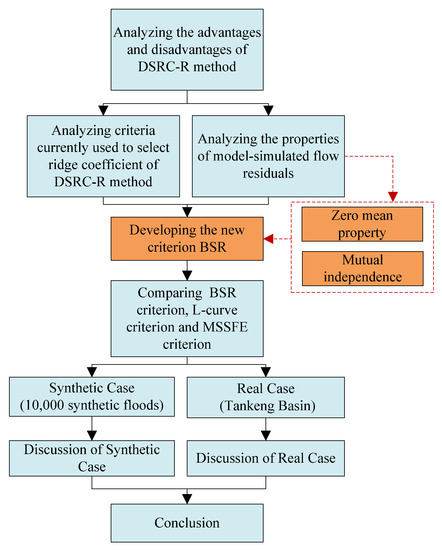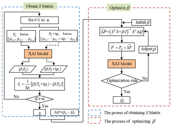 can be introduced into Equation (3) to update the rainfall series, and then the model can be rerun with to correct the forecasted flow. The flow chart of the DSRC-R method is shown in Figure 2.