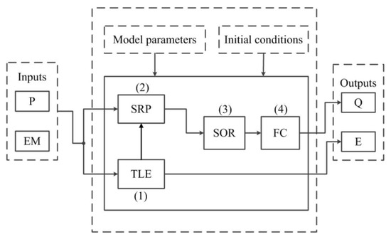 Schematic diagram of the Xinanjiang (XAJ) model. TLE represents the three-layer evapotranspiration model; SRP represents the saturated runoff production layer; SOR represents the runoff separation layer; and FC represents the flow concentration layer.