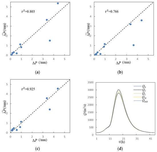 As it is depicted in Figure 5a–c, the estimated value of the rainfall error under the BSR criterion is the closest to the “true” value, the total difference is 0.8 mm (1.2 mm errors under the L-curve criterion and 0.9 mm errors under the MSSFE criterion), the correlation coefficient reaches 0.962 (0.875 under the L-curve criterion and 0.896 under the MSSFE criterion) and the spots are evenly distributed on both sides of the 1:1 line. All of the above contribute to the DSRC-R method achieving the best performance under the BSR criterion. As it is shown in Figure 5d, the indicators RPT and RRD have values of 0.9% and 0.6%, respectively, under the BSR criterion. RPT has a value of 2.7% and RRD a value of 1.4% under the MSSFE criterion. Lastly, RPT has a value of 4.5% and RRD a value of 3.8% under the L-curve criterion. In a typical flood, the optimal value of under the MSSFE criterion is 2.47, which is significantly less than 651.33 under the BSR criterion. This result shows that the instability of the method is not sufficiently alleviated. Therefore, the points in Figure 5a are scattered. The L-curve criterion does not fully consider the properties of the simulated residuals, meaning the flow correction result in Figure 5d is not satisfactory.
