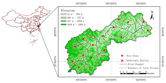 The research basin in this study is Tankeng basin, with a total area of 3330 km2 and 15 precipitation stations, which is located at the tributary of the Ou River in Zhejiang Province. Tankeng basin is in the subtropical monsoon climate zone, and it enjoys a temperate climate with well-marked seasons and plenty of rainfall and sunshine. Runoff from Tankeng basin is mainly supplied by precipitation. The annual average precipitation of Tankeng basin is between 1500 and 2100 mm, and multi-annual average evaporation is 969.9 mm. The precipitation spatial distribution is uneven, as is the annual precipitation temporal distribution; based on this, the entire year can be divided into three parts with the first part “spring rain” ranging from March to April, the second part “plum rain” ranging from May to June and the third part “thunderstorm” ranging from July to September. In Tankeng basin, multi-annual average flow is 120 m3/s, and the maximal runoff happens in June, with the proportion of the entire annual runoff reaching up to 19.7%. More details about Tankeng basin and its rainfall station distribution are illustrated in Figure 6.