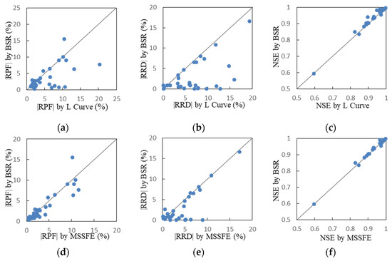 Figure 7a–c show the comparison of the statistical indicators of 31 floods between the BSR criterion and L-curve criterion. Figure 7a,b are inclined to the lower side of the 1:1 line, and Figure 7c is inclined to the upper side of the 1:1 line, indicating that the BSR criterion is more effective than the L-curve criterion for most floods. In terms of the flood peak and runoff depth, the BSR criterion is more effective in 24 floods and 29 floods, respectively; additionally, the NSE of 23 floods is greater under the BSR criterion. Figure 7d–f show the comparison of flood indicators between the BSR criterion and MSSFE criterion. Similar to Figure 7a–c, under the BSR criterion, the forecasting accuracy of 21 flood peaks and 25 flood runoff depths is higher, and NSE of 18 floods is larger, indicating that the BSR criterion has more advantages over the MSSFE criterion for most floods.