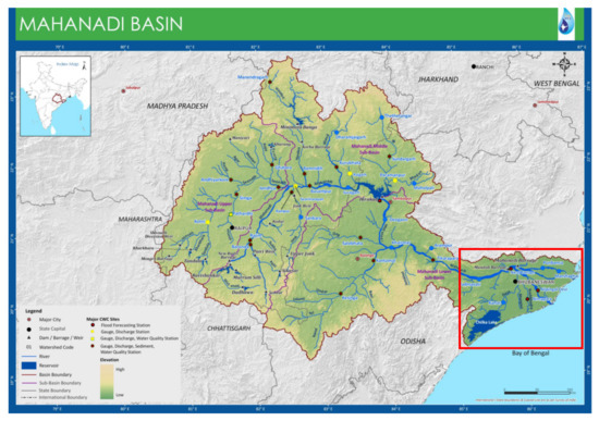 Study area: Mahanadi River Basin and Mahanadi delta region (red bounded box). Source www.india-wris.nrsc.gov.in (accessed on 15 March 2020).