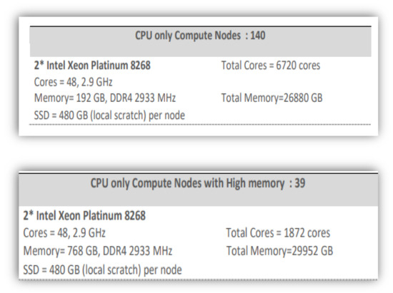 PARAM Brahma system is based on processor Intel Xeon Platinum 8268 with a total peak performance of 850 TFLOPS. The cluster consists of 189 nodes (2 + 4 + 4 + 179) connected with BullSequana XH2000 HDR 100 Infini Band interconnect network. The system uses the Lustre parallel file system. It consists of 2 Master nodes, 4 Login nodes, 4 Service nodes and 179 CPU nodes. The CPU nodes are workhorses of PARAM Brahma. Specifications of PARAM Brahma is shown in Figure 2. All the CPU intensive activities are carried on these nodes. Users can access these nodes from the login node to run interactive or batch jobs. However, the full capacity of the system was not used, and only 60 nodes (48 cores per node) were used for the simulation. Experimental simulation runs were also carried out to check the performance and time taken with an increase in the number of nodes. Some of the nodes have higher memory, which were also used to carry out memory intensive parts of the model run.