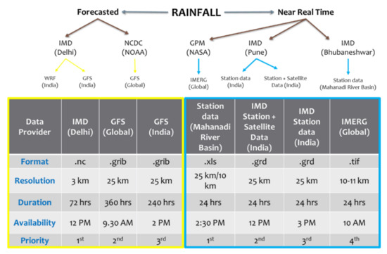 Figure 3. Prioritisation of rainfall products as used in the simulation. - River discharge: Among the several real-time hydrological inputs for hydrological modelling, researchers [25,26,27,28] have found that river discharge, which is one of the uncertain variables, has to be considered for calculating the actual inflow of water released from dams and barrages into the flood plain. Considering the impact of discharge and controlled river discharge acquired from CWC data at two barrage sites, Naraj and Jobra (Mahanadi), located upstream of the delta region, were included in the simulation (see Figure 4).