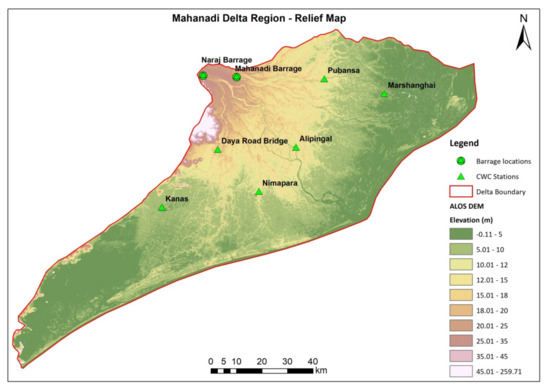 The study area selected is the Mahanadi River Basin. It is the fourth largest river basin of India and a vital water resource for the State of Odisha. Out of the overall catchment area of Mahanadi of 145,600 sq km, 65,600 sq km of the area is in Odisha, which comprises 42.15% of the geographical area of the state and nearly 4.3% of the total geographical area of the country (Figure 1). Mahanadi river’s annual flows account for 59.16 billion m3 from the catchment in Odisha, according to the India-WRIS data (Water Resources Information System, Govt. of India). The work mentioned in this paper has been conducted over an area of 9225 sq km out of the total 145,600 sq km area of the Mahanadi basin, covering the deltaic region of the basin.