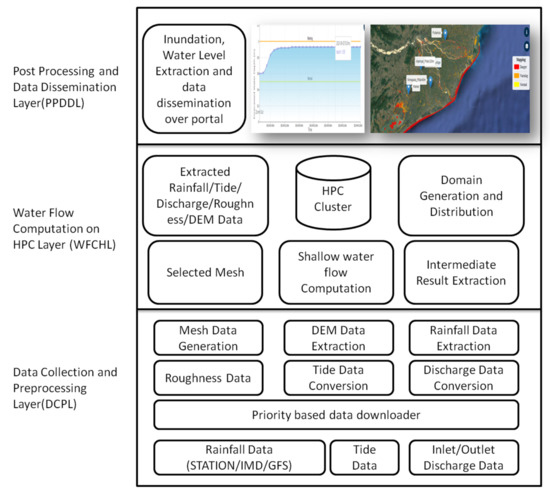 Efficient flood forecasting depends on various processes performed on time and in a correct sequence; for example, precise data collection, correct data format conversion (rainfall, tide, discharge etc.), efficient use of HPC (C-DAC NSM HPC clusters), and on-time result generation. To address all these requirements, a multi-layered architecture is detailed in this paper, as shown in Figure 5. The variation of these parameters from basin to basin and their effects on the efficiency of the model encouraged proposing this layered architecture. The proposed architecture involves three layers: Data Collection and Preprocessing Layer (DCPL), Water Flow Computation on HPC Layer (WFCH), and the topmost layer called the Post Processing and Data Dissemination Layer (PPDDL). A specific set of functionalities are performed by every layer independently, and their outputs are used in the higher layers. Priority and availability-based collection of roughness data, rainfall data (Station/IMD/GFS), tide data, and inlet/outlet discharge data are done at DCPL from various sensors and manual resources. Pre-processing involves discharge data conversion, tide data conversion, roughness data, DEM data extraction etc. After pre-processing, the extracted rainfall/tide/discharge/roughness/DEM data is used by WFCH for performing further computation to forecast floods in any geographical area effectively. Inundation, water level extraction, and data dissemination over the portal are done at PPDDL. This layer manages alerts and notifications as per user requirements.