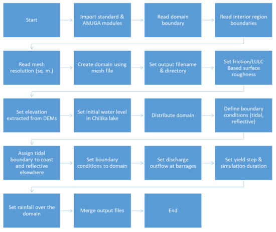 ANUGA Hydro is a free and open-source software package with high capability to model hydrodynamic shallow water equations, which makes it suitable for predicting hydrological disasters such as riverine flooding, storm surges, and tsunamis. A flood inundation model for the delta region within the Mahanadi River Basin was designed using this software. The model routes the water from various sources such as rainfall, upstream discharge, and coastal tides over the topography of the study area, taking into account the spatial variability of the roughness coefficient. The model mimics the properties of the physical basin within the computational environment. The parameters that affect the water flow are set within the computational environment to predict flood inundation. Most of the ANUGA components are written in the object-oriented programming language Python. Computationally intensive components are written for efficiency in C routines working directly with Python NumPy structures. It also has an ANUGA viewer for graphical 3D rendering for animating the output files. It has additional viewing options using Crayfish (QGIS), which is extensively used in the current study.