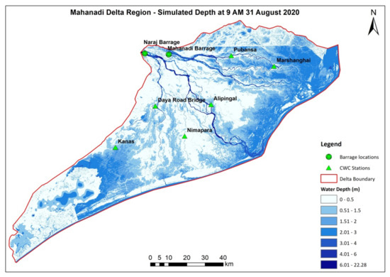 - The model result for a 5–day simulation of the delta region was obtained within a span of 3 h 26 min on 60 Nodes of PARAM Brahma. The simulated inundation output within Mahanadi delta region for 31 August 2020 is shown in Figure 7 below.