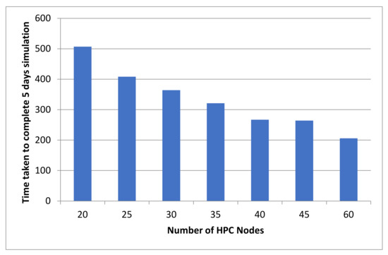 As demonstrated in the results section, it was noted that the computation speed improved with an increase in the number of nodes on the HPC system, leading to better flood forecast lead time. However, it reaches a point when the speedup does not have an increasing trend when applied to the same area size with an increase in the number of nodes. It reaches a certain stagnancy as far as computation time is concerned. More analysis, however, is required to acquire optimisation for HPC performance versus resolution of the simulated area.