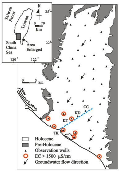 - Chiang, C.J. Seawater intrusion in the Pingtung plain. Bull. Cent. Geol. Surv. MOEA 2000, 13, 25–50. (In Chinese) [Google Scholar]