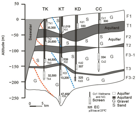 Four aquifers (F1 to F3-2), down to 300 m in depth, were identified and, at most, four observation wells were installed at one site (Figure 3). Lengths of screens, ranging from 12 to 30 m, were placed on the bottom of observation wells. Aquifers in the area are composed of gravel and sand, and are separated by fine-grain, clay-rich aquitards (T1 to T3). A total of eight sites, all at the coastal location, presenting saline groundwaters with EC’s higher than 1500 μS/cm (at 25 °C), were first noted in WRA reports during investigations conducted from 1995–1998.
