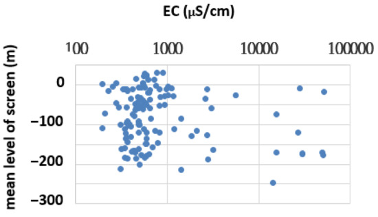 Groundwater EC and the mean level of the screen (the elevation head) for the 134 observation wells are provided in Figure 4. In 2012, 19 observation wells displayed EC’s higher than 1500 μS/cm (Table 2). An EC of seawater of 52,000 μS/cm, with a density of 1026 kg/m3, and a density of freshwater (EC < 1500 μS/cm) of 1000 kg/m3 can be assumed. The densities of saline water (Di) within observation wells can be calculated using the following formula [25]: