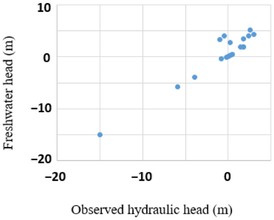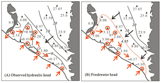 The misuse of observed hydraulic heads causes a misinterpretation of the flow direction of saline groundwater [2,26]. For example, Figure 6A displays the distributions of observed hydraulic heads (m) within aquifer F3-2 during 2012. The direction of groundwater flow was from the KT site to the TK site, from land to sea, according to the observed hydraulic heads. However, according to the freshwater heads (Figure 6B), the flow direction should be the opposite (from sea to land).