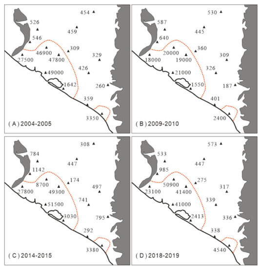The groundwater EC (μS/cm at 25 °C) in the F3-2 during 2004–2019. The area marked by a red dashed line represents a saline area in which ECs were > 1500 μS/cm. (A) 2004–2005; (B) 2009–2010; (C) 2014–2015; (D) 2018–2019.