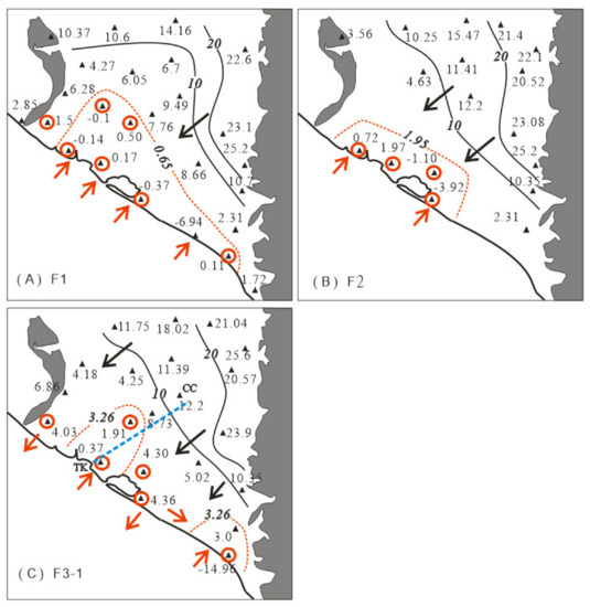 Averaged depths were 75, 125, and 190 m, and the freshwater heads of seawater at those depths were 1.95, 3.26, and 4.95 m for aquifers F2, F3-1, and F3-2, respectively. In Figure 6 and Figure 8, potential seawater intrusion areas are shown with red dashed lines. The deepest aquifer, F3-2, displayed the largest area of potential seawater intrusion, approximately 7 km towards land.