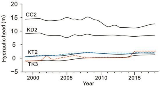 During the period from 1999–2018, the flow direction was from CC2 to TK3, that is, from land to coast, according to the observed hydraulic heads. However, after 2015, a completely different explanation is explained by the freshwater heads of saline water within observation wells TK3 and KT2. According to the freshwater heads (Figure 9), the flow direction between TK3 and KT2 changed in 2015 (i.e., from coast to land).