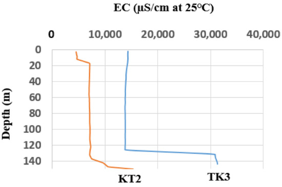Vertical EC logging values within wells KT2 and TK3 on 19 July 2021.
