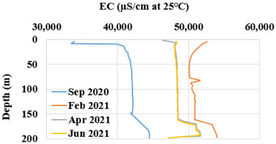 EC logging values within an observation well were not only vertically varied but also varied with season. Figure 11 shows vertical EC logging values within well TK4 from 2020–2021. EC values ranged from 35,000 to 55,000 μS/cm. Values were higher during the dry season (February 2021) and lowered during the rainy season (September 2020). In summary, for collecting density information within observation wells in saline aquifers, we recommend EC logging using a monthly sampling interval instead of the purging and sampling method.