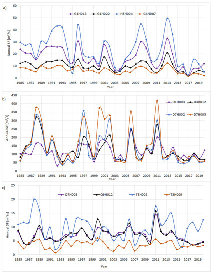 Annual streamflow time series for selected stream-gauge stations in (a) the Western Cape, (b) Northern Cape and (c) Eastern Cape study sites over the period 1985–2020. The abbreviations appearing on the station names represent drainage regions where the stations are located, and H in the middle gives the classification of data type—in this case, hydrological.