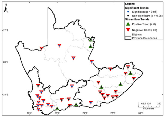 Historical trends of streamflow from 1985 to 2020 across the three Cape provinces were assessed based on the MMK test. The results are presented in Figure 3, where the upward and downward triangles correspond to positive and negative trends, and the blue and black dots inside the triangles represent significant and non-significant trends, tested at 95% significant level, respectively. In general, the study area demonstrates notable drying trends. In particular, 75%, 88% and 67% of the stations in the EC, WC and NC provinces, respectively, depict negative annual trends in streamflow. Overall, 80% of the stations exhibit a negative trend in streamflow across the three provinces. In addition, 38% of the detected negative trends are statistically significant at a 95% significant level. While most areas in the WC province are known to be “all-year rainfall” [10,28], there has been either a shift (where there was no rainfall in some seasons) or delayed/insufficient rainfall to benefit water resources. These results are consistent with the continued drought conditions that persist to burden the supply of water resources, particularly in the EC and WC provinces.