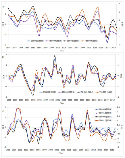 In this study, the SSI was computed for three (e.g., SSI-3) and six (SSI-6) accumulation periods and categorized by using the classification criteria of SPI, recommended by the World Meteorological Organization standards [41] as given in Table 2. The selected accumulated time-steps cover both seasonal (or agricultural) and supra-seasonal, where water resources are likely to be affected due to insufficient and/or delayed precipitation. Annual features of the SSI were calculated based on the hydrological calendar year (e.g., October–September).