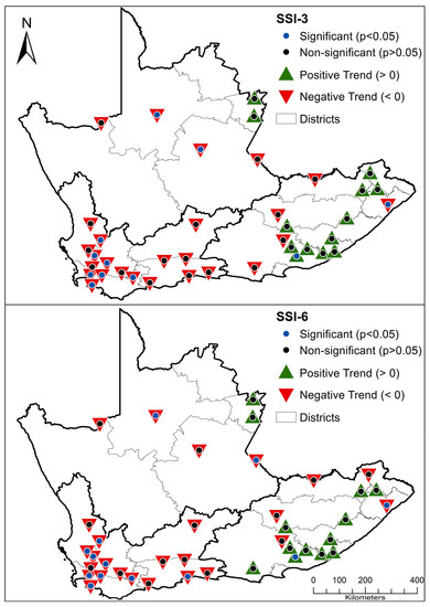 The MMK trend test results of the SSI computed from streamflow data at 3- and 6-month accumulation time-steps across the study sites are shown in Figure 5. In this figure, the top and bottom panels correspond to trends based on 3- and 6-month cumulative periods, respectively. Positive (negative) and significant (non-significant) trends are shown by green (red) triangles and blue (black) dots, respectively. The test results depict similar annual trend patterns across the accumulation periods and stations within the study area. Dry conditions are evident across the study area, with all the stations in the WC exhibiting negative trends for both SSI-3 and SSI-6 accumulation epochs. Similarly, most of the NC regions, where gauge stations are located, depict negative trends, reflecting a long-term hydrological drought pattern. On the contrary, most of the stations (approximately 68%) in the EC province depict notable increasing trends in SSI values across the time-steps for the period 1985–2020. These trends are, however, not statistically significant at the 95% confidence level.
