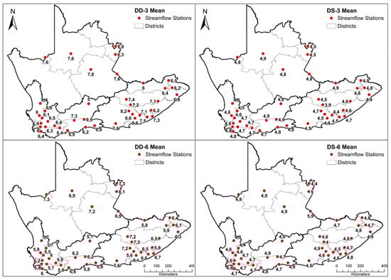 Figure 8 depicts the spatial distribution of drought events estimated from the SSI at 3- and 6-month accumulation time-steps across the three Cape provinces. These events were estimated based on the condition that the SSI exhibited continued negative values for 2 months or more. The results of SSI at 3- and 6-month accumulation time-steps at six stations in the NC region indicate that there were 21–30 and 14–25 drought events during the period 1985–2020, respectively. The EC province experienced 24–36 and 14–30 drought episodes based on the analysis of SSI at 3- and 6-month accumulation periods, respectively. In the WC province, drought episodes ranged from the seven, which was the lowest, to 39, the highest, for the SSI-3 analysis. Drought episodes were reduced when considering the SSI-6 analysis, with the events ranging from five at the lowest to 27 at the highest. The J2H018 in the WC region is the solely stream-gauge station that has recorded the lowest drought events during the 3.5 decades. Such a huge deviation requires further inspection of streamflow data for this station. Overall, the results indicate that SSI-3 exhibited greater drought events as compared to the SSI-6 accumulation period. The drought events in Figure 8 were used to estimate the return levels of DD and DS at both 3- and 6-month accumulation time-steps.