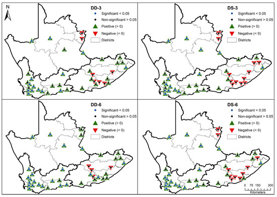 The trend analysis results indicate that DD has significantly increased across the study area, with exceptions to parts of the EC province (see the first column of Figure 7). Approximately 47% of the observed trends in DD are statistically significant at the 95% statistically significance level. The severity of drought (second column of Figure 7) has increased during the study period (1985–2020), particularly in the WC and NC provinces. Overall, about 78% of the stations exhibit positive trends in DS, with 48% of the observed trends being at the statistically significant 95% significance level. In the EC province, only 18% of the stations indicated an increase in the DS, while the majority of the stations (82%) displayed a decrease in the severity of drought over the 1985–2020 study period.