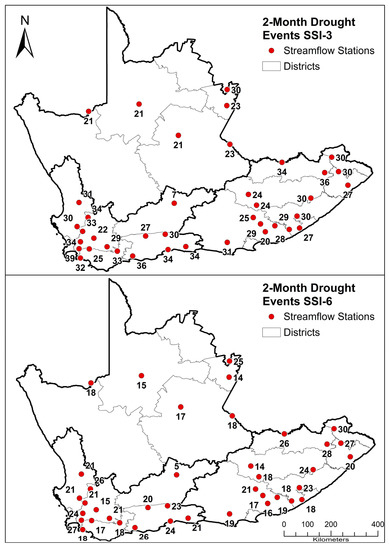 The SSIs calculated for the 3- and 6-month time scales were used to characterize hydrological drought in terms of drought duration (DD) and drought severity (DS) across the three Cape provinces. Following various studies (e.g., References [42,43]), the following procedure was used to calculate the DD and DS:
